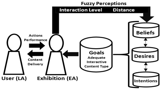 The EA can perceive its interaction context with perceivers (fuzzy perceptions) and act accordingly with effectors (intentions). The exhibition (EA) perceivers must perceive and act to satisfy the user’s requirements. Perception is an internal action where the agent captures information from its interaction context, formulating its beliefs from perceptions combined with prior knowledge of the interaction context (i.e., the EA has an interactivity perceiver that can measure the interaction level of a user to some degree of error; due to its prior knowledge, it creates the belief if the user has a high or low interaction level).