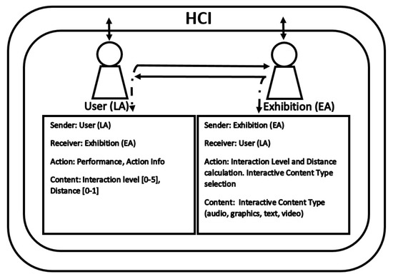 In our research, HCI is represented in an interactive museum. The involved elements—user (LA) and exhibition (EA)—are developed and simulated with a Jason-based programming language on AgentSpeak (L) ([40,41,42,43]).