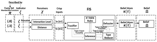 An important process that impacts all museum elements is how the HCI—aided by exhibition (EA)—obtains fuzzy perceptions from the user’s performance. This process begins with the perceiver () observation of changes in the surrounding environment; this change can be represented as a set of indicators (), with every indicator being described by set membership function values (). The indicators () can be perceived by perceivers , which can sense these values and consider the inputs (interaction level and distance) of the FIS. Through its inference, the FIS generates the output (interactive content type). The fuzzy value result will be considered a belief atom (), where () is a belief set. Figure 7 depicts the fuzzy perception process of the exhibition EA.