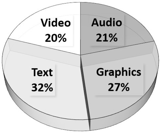 In this research, we obtained noteworthy results about the percentage of interactive content types delivered. The sample results obtained were: 20% of users received content type “video”; 21% of users received content type “audio”; 32% of users received content type “text”; and 27% of users received content type “graphics”. This means that the interactive content type “text” is the most adequate to interact with in this kind of interactive environment, helping to avoid possible interruptions originating from inadequate content. Figure 8 depicts these results.