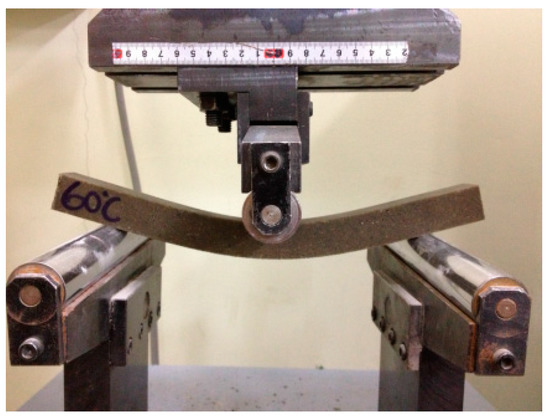 To assess the displacement conformability of the polysulfide polymer concrete, the load–displacement relationships were measured at the above-mentioned curing temperatures. The displacement tests used the 3-point loading condition, which was the same condition used for the flexural strength tests. The only difference was that in the displacement tests, a linear variable differential transformer, an electromechanical transducer used to measure various types of displacements, was installed at the center of each specimen to measure the displacement of the specimen caused by the applied load. For the strength and displacement tests, a universal testing machine with a maximum load of 300 kN (UT-200, MTDI Inc., Deajeon, Korea) was used. Figure 1 and Figure 2 show images of the setups for the compressive and flexural strength tests, respectively.