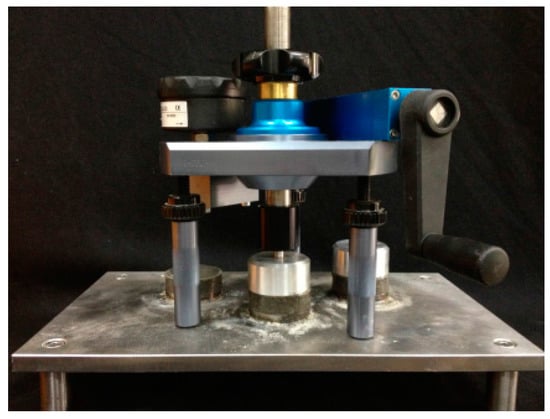 One of the key factors affecting the performance of polymer concrete is its ability to bond to substrates. In this study, a steel plate with a yield strength of 400 MPa was used as the substrate material. On this steel plate, cylindrical specimens of polymer concrete (50 mm in diameter and 30 mm in height) were placed and cured for 7 days. For the bond strength tests, a pull-off tester (Dyna Z16, Proceq S.A., Schwerzenbach, Switzerland) was employed and the samples were tested according to ASTM C1583 [33]. A photograph of the setup for the bond strength tests is shown in Figure 3.