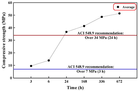 Rapid hardening of materials used in the construction of bridges and buildings can allow structural members to resist the large stresses induced by traffic and work operations after a shorter interval of time. Because of the short hardening time of polysulfide polymer concrete, it can be applied to structural members at nighttime and the members can be strong enough to handle traffic flow the next day. Note that, as shown in Figure 4, the compressive strength of the polysulfide polymer concrete used in this study complies with the value, over 34 MPa within 24 h and over 7 MPa within 3 h, recommended in the ACI 548.9 guideline [35].