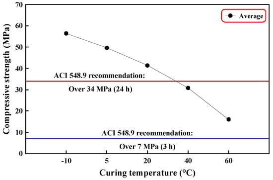 Interestingly, a higher curing temperature has a positive effect on the initial strength of polymer concrete by increasing the rate of the chemical reactions, but it has a negative effect on the final strength. In particular, the specimens cured at temperatures over 40 °C had a compressive strength lower than 34 MPa within 24 h (as shown in Figure 5), which is the minimum compressive strength recommended in the ACI 548.9 guideline [35]. As a result, curing temperatures higher than 40 °C can be considered to have an overall adverse effect on the compressive strength of polysulfide polymer concrete.