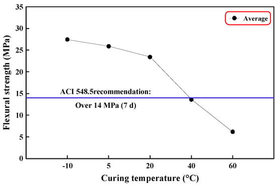 - The development of flexural strength depended significantly on the curing temperature. The flexural strength decreased gradually up to a curing temperature of 20 °C and then decreased rapidly above this temperature. The specimens cured at temperatures above 40 °C showed a flexural strength value lower than 14 MPa, which is the minimum value recommended in the ACI 548.5 guideline.