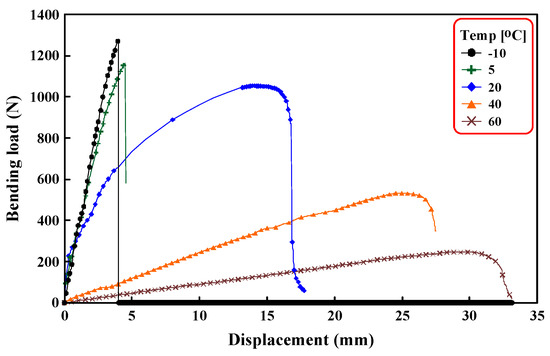 Figure 7 shows the load–displacement relationships of all of the specimens subjected to flexural strength tests at various curing temperatures. The beams cured at −10 °C and 5 °C exhibited a linear load–displacement relationship; after the maximum load was applied, these beams underwent brittle fractures, similar to the type of behavior observed in over-reinforced concrete beams.