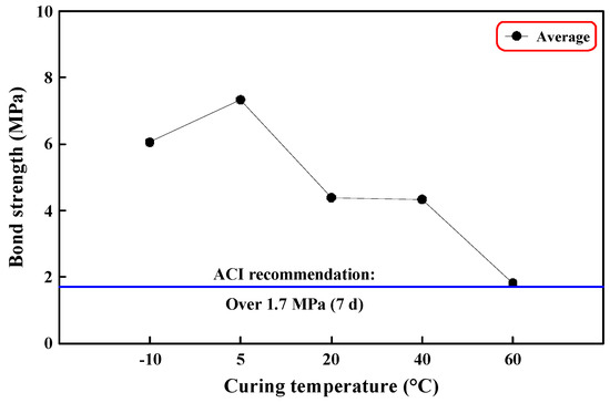 Further, as in the case of flexural strength, the bond strengths for the curing temperature range of 20–40 °C were observed to decrease rapidly as curing temperatures increased above 20 °C. Additionally, as was the case with the other two strengths, the bond strength showed the lowest value for a curing temperature of 60 °C. This result was likely because of the dependence of the bond strength on the bond performance at the interface between concrete and steel. At curing temperatures higher than 20 °C, the bonding performance of the polysulfide polymer concrete to steel is negatively affected. However, the results in Figure 8 show that within 7 days of curing, all of the bond strengths achieved values greater than 1.7 MPa, which is the recommended minimum value in the ACI 548.9 guideline [35].