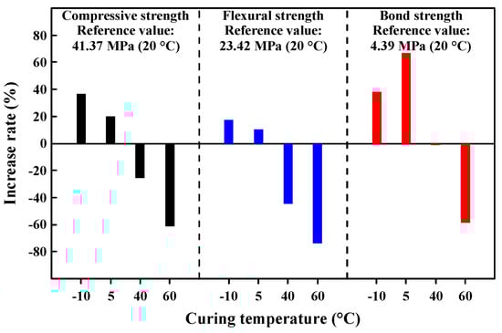 The results plotted in Figure 9 show that the rates of increase in the compressive, flexural, and bond strengths become higher with a decrease in the curing temperature, and vice versa. This tendency can be attributed to the strong dependence of these strengths on the curing temperature. The maximum rate of increase in the compressive and flexural strengths was found to occur at −10 °C, and that in the bond strength was found to occur at 5 °C. The maximum rates for the compressive strength, flexural strength, and bond strength were 36.3%, 17.2%, and 67.0%, respectively. Conversely, the maximum rates of decrease for the compressive strength, flexural strength, and bond strength were all observed at 60 °C, with values of −61.2%, −73.7%, and −58.5%, respectively. These results suggest that it would be impossible to improve the strength of polysulfide polymer concrete by employing a curing temperature higher than 20 °C.