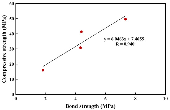 To determine the relationship between the compressive, flexural, and bond strengths, the corresponding strength ratios were assessed at various curing temperatures. The results are presented in Table 8, showing that the average ratio of the flexural strength to the compressive strength is 0.476, the average ratio of the bond strength to the compressive strength is 0.123, and the average ratio of the bond strength to the flexural strength is 0.264.