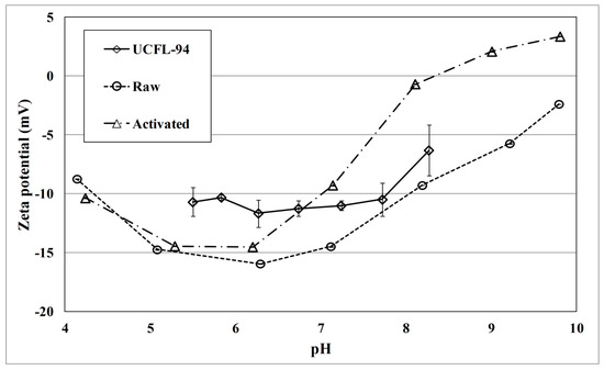 The zeta potential assessment performed on the test E. coli strain UCFL-94, raw, and activated hydrochar used in the column experiments showed negative values in the pH range of 6.6–6.8 (Figure 1). The zeta potential of raw hydrochar was slightly increased by KOH activation from −15 mV to −13 mV. Also, a negative zeta potential of −11 mV was measured for the E. coli UCFL-94 suspension.