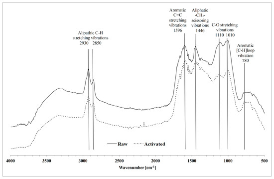 The qualitative composition of surface functional groups was not significantly altered by the KOH activation. The raw and activated hydrochar samples showed similar peaks in the FTIR-PAS analyses (Figure 2). The spectra in the region between 1700 and 1300 cm−1 and the bands at 3800 cm−1 were assigned to the residual water content in the hydrochar samples. The bands in the range of 2930–2850 cm−1 corresponded to aliphatic C-H stretching vibrations [24,25,26]. The bands at 1600 and 1446 cm−1 referred to aromatic C=C stretching vibrations [26,27] and aliphatic CH2 scissoring vibrations [28,29], respectively. A modest vibration shift was observed from the bands in the range of 1446–1400 cm−1 of the activated hydrochar samples. This referred to the deprotonation of the OH at the surface of hydrochar. Te bands in the 1110–1010 cm−1 region were derived from O stretching vibrations [25,27,28]. The bands at 780 cm−1 was derived from out-of-plane bending vibrations of aromatic C-H bonds [24,26].