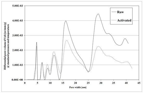 The BET analysis performed on the raw and activated hydrochar showed a specific surface area of, respectively, 25.3 and 18.5 m2/g. Figure 3 shows the results of the QSDFT pore size (differential pore volume) distribution, which demonstrates the pore volume composition attributed to the specific pore widths. The pore volume derived from the micro and mesopore range was negligible. A clear decrease in the surface area derived from the KOH activation was observable in the pore fraction, with a size >15 nm.