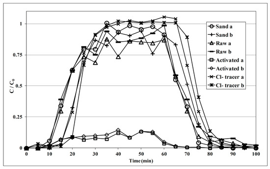 Breakthrough curves of E. coli from small column experiments carried out at a flow rate of 1 mL (0.20 cm)/min.
