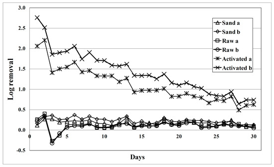 Based on our observation, it could be speculated that the extended contact time between E. coli cells and sand surfaces provided more chances for bacterial attachment due to the motility of E. coli cells [35] or Brownian diffusion [36]. In contrast, the advantageous effect of the idle time on E. coli removal was negligible when either raw or activated hydrochar was supplemented in the sand bed. The provision of carbonaceous surfaces in the sand medium could have induced more desirable conditions for E. coli survival, by providing extra nutrients and more protection against external stress factors [37,38,39,40]. In order to clarify the E. coli inactivation mechanism during the idle time, more investigations on E. coli–surface interactions under static conditions are recommended.