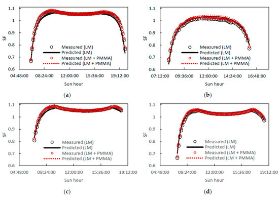 Actual versus simulated SF for the devices based on LM and LM + PMMA for four different days: (a) 21 June 2016, (b) 23 December 2016, (c) 29 June 2016 and (d) 18 August 2016. LM: a device based on a lattice-matched GaInP/GaInAs/Ge solar cell; LM + PMMA: a device based on a LM solar cell and a poly(methyl methacrylate) (PMMA) Fresnel lens.