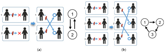 Illustration of (a) two-way and (b) three-way kidney exchange program (KEP).