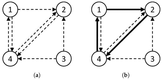 As we briefly mentioned before, the KEP model can be expressed by a digraph , called a KEP graph in this paper, where V and A indicate the set of vertices and arcs of the graph G, respectively. Figure 2 presents an example of G and a solution to the model (i.e., possible kidney exchanges on a KEP graph). In Figure 2a, a vertex corresponds to a current incompatible pair consisting of a patient i and a donor i, and an arc indicates the compatibility between donor i and patient j, which means that donor i can provide his or her kidney to patient j. Figure 2b demonstrates an example of a feasible solution. The thick arrows represent an exchange cycle among pairs 1, 2, and 4.