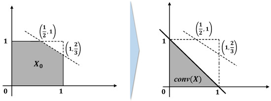 The linear programming of this polytope is given as , and the convex hull of X is given as (see Figure 3).
