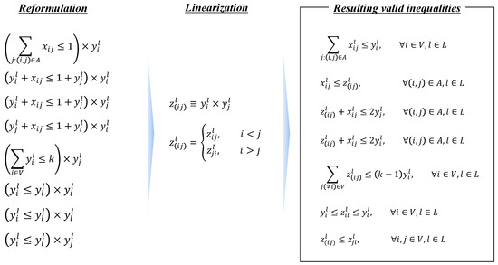 - (Reformulation) Multiply each constraint of by each of the factors , , , and . This process generates various duplicated or redundant inequalities; thus, we summarize the valid inequalities only, as follows: