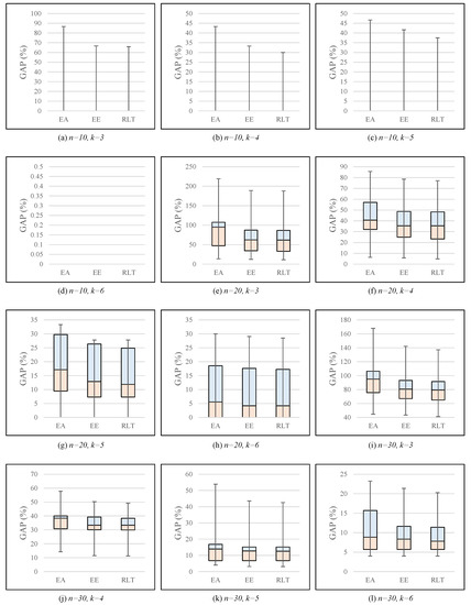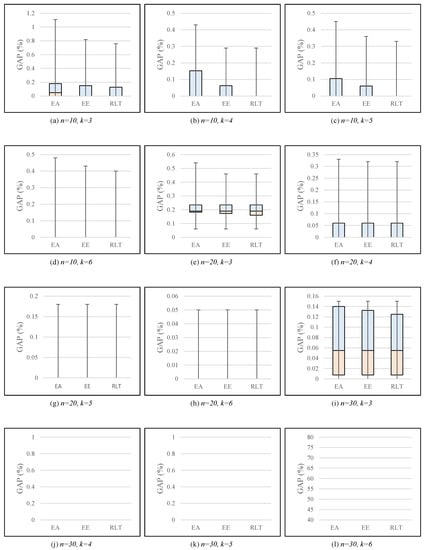 Figure 5 presents box plots of the GAPs (%) produced by each formulation from problem instances for each combination of . From the figure, we can observe that our RLT formulation yielded the lowest average GAPs, and that furthermore, the variability of the GAPs produced by our RLT formulation was also lower than that of the best-known compact formulations. Specifically, both the maximum and minimum GAPs, as well as the difference between the lower and upper quartiles, significantly dropped from the EA formulation to the EE formulation, and then further again to the RLT formulation. Moreover, such observations were consistent for every combination of . The results imply that the EA formulation is highly dominated by the EE and RLT formulations, and moreover, that our proposed RLT formulation is more reliable than the EE formulation in terms of solution quality—that is, our approach produces more reliable and higher quality solutions than the best-known compact formulations, without compromising computational time.
