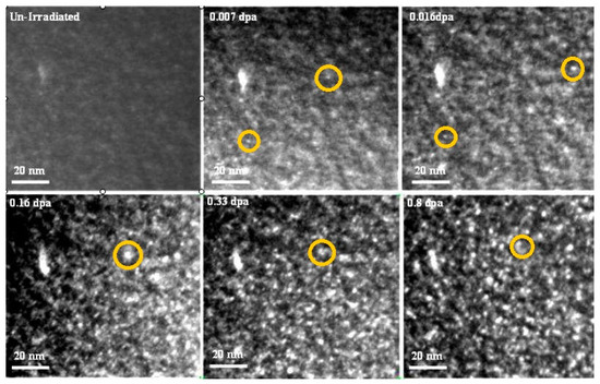 Series of dark field micrographs, taken during in situ irradiation experiment on Zircaloy-2 at 573 K, showing the formation of <a>-type loops, which present as bright dots in dark field. The orange circles in each micrograph enclose one or more dot-like loops.