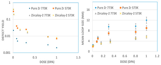 The DY calculated from Equation (1) at each dose level, plotted as a function of dose, at each irradiation temperature has been provided in Figure 4. From Figure 4 it is clear that the DY decreases with dose. The comparison of Zircaloy-2 and pure Zr data shows that the presence of alloying elements results in a higher DY at 773 K.