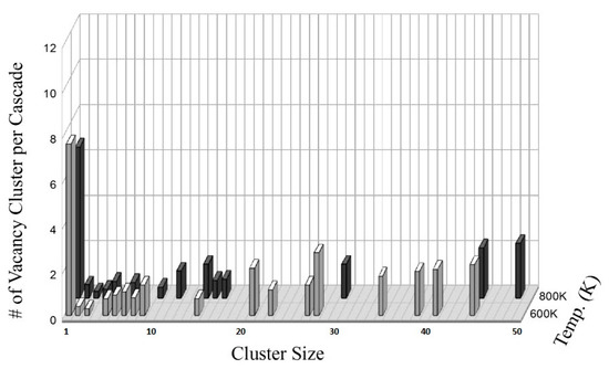 A similar tendency of cluster distributions is also observed for vacancy clusters, as shown in Figure 7.