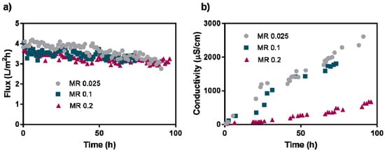 (a) Flux and (b) permeate conductivity profile of composite PVA/PVDF membrane with different molar ratio of glutaraldehyde to PVA repeat unit (MR 0.025, 0.1, 0.2) using a feed solution of 100 g/L NaCl at 65 °C.