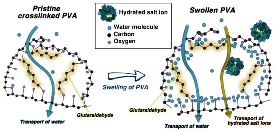 Schematic diagram of salt passage through the swollen PVA membrane (not to scale).