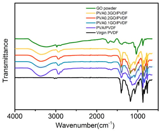 FT-IR curves of PVA-GO/PVDF membranes with GO loading of 0.1, 0.2 and 0.3 wt. %.