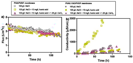 GO nanosheets are known to improve the anti-fouling property for the mixed matrix filtration membranes [18,20,21,22,23]. This is ascribed to the improved membrane’s hydrophilicity due to the hydrophilic groups on GO. However, whether GO can promote the anti-fouling performance of pervaporation membranes has not been explored yet. The fouling study on pure PVA/PVDF composite membranes (Figure 10) showed that the presence of 10 mg/L humic acid in 100 g/L NaCl aqueous solution had a negligible effect on the flux, but increased the permeate conductivity significantly (from 370 µS/cm to 2.8 mS/cm at the end of 72 h operation). This may indicate that the attachment of humic acid on the surface of PVA layer and the binding between humic acid and salt ions accelerated the salt transport through the membrane [55]. With GO incorporated in the PVA coating layer, increased permeate conductivity was also observed (from 140 to 355 µS/cm at the end of 120 h operation), which well aligned with the membrane without GO. However, the increase was less significant. This indicated that the incorporation of GO in PVA matrix stabilized the composite membrane’s performance when processing brine containing organic foulant (humic acid).