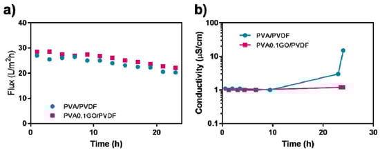 (a) Flux and (b) permeate conductivity profiles of the composite membrane PVA/PVDF, and PVA0.1GO/PVDF prepared by cast coating method using different feed solution.