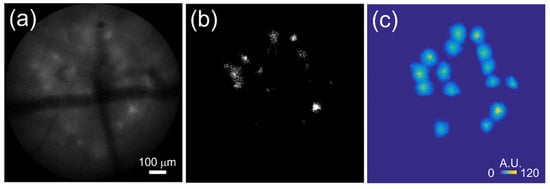 Gray distance compensation. (a) The raw fluorescence image collected by the fiber optic imaging device. (b) Binarization of the post gray transformation image in which white regions imply the active regions. (c) Plot of active regions extracted by distance compensation. A.U.: arbitrary unit.