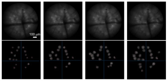 Extracted active centers in a series of images. The first row shows four images of GCaMP3-expressing astrocytes taken at the same field of view at different times. The second row shows the extracted cellular active centers of each image in the first row. The scale shown in the first panel corresponds to all figures.