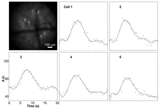 Figure 5 plots the change of fluorescence intensity versus frame for five of the active regions found in Set 1. For each plot, the X-axis is the lapsed time and the Y-axis is the mean intensity of the 15 by 15 pixels square around the activity center. The discrete dots denote the mean intensity of the active region in each frame; the blue lines are the polynomial fitted curve to each data point (generated with MATLAB curve fitting tools). The plots illustrate that these defined activity areas exhibit distinct intensity changes with similar time-locked characteristics.