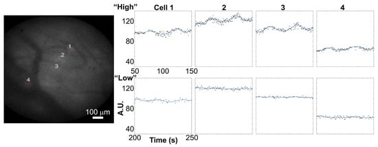 Figure 6 shows the fluorescence intensity change over frames for four of the active regions in Set 2. To illustrate relative activity patterns for the four cells at different times, Set 2 is subdivided into two sections: with 50–150 s corresponding to the time of “high” cellular activities and 200–250 s to “low” cellular activities. Although the four regions share similar kinetics of intensity change, there exists a significant difference in the magnitude of change. For example, compare the intensity rise from 55 to 75 for cell 3 and from 90 to 120 for cell 4. These differences in regional fluorescence changes highlight the heterogeneous nature of astrocyte responses in the intact brain and show that this analysis method can aid in identifying and extracting information about astrocyte activity in different physiological contexts.