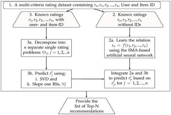 As can be seen from the figure, the model starts by loading the multi-criteria dataset and dividing it into two parts. One part contains only the ratings ( to shown in step 2) to train the SMA-based neural network for learning the relationship between the criteria ratings and the given in (5) at page 4. However, this part did not require the user- and item-ID. The data in step 3 contains the criteria ratings (), user-ID, and item-ID to learn the behavior of users relative to each attribute of the items. Here, the overall rating is not needed. Similarly, The two traditional techniques (SVD and slope one) learn and predict the criteria ratings for new items. Finally, the model predicts the overall rating for new items by integrating the trained neural network and the single rating technique. Top N items will be recommended to the user based on the strength of the corresponding of the items.