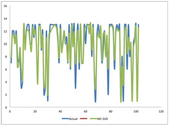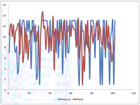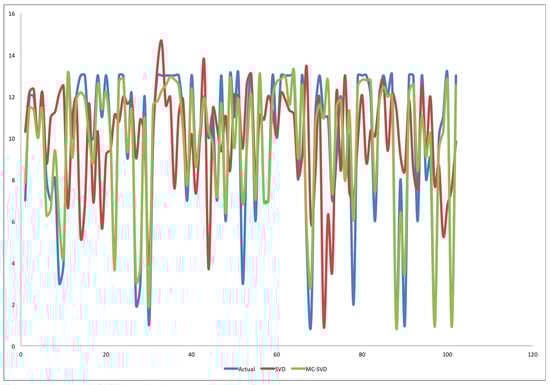 Furthermore, to emphasize the good performance of our models, we conducted some statistical analysis by extracting some of the predicted ratings of all the algorithms and comparing them with the actual ratings from the dataset. Table 8 contains the percentage correlations between the actual and predicted values for each of the four experimented techniques. As we have already seen when giving the basic statistics of the dataset in Table 2, the minimum and maximum ratings in the dataset are 1 and 13, respectively. We also found the corresponding minimum and maximum values from the predicted values of each of the techniques, and the result is also included in Table 8. However, the table gives only numerical values to show the strength of the relationships that exist between the predicted ratings and actual ratings. For instance, if there exist some deviations or outliers between the ratings, the correlation in the table did not show the real behavior of each technique. It is therefore important to further analyze the monotonic relationship between them. Figure 2, Figure 3 and Figure 4 are graphs of actual vs. -, actual vs. , and actual vs. the two techniques (- and ), respectively. Figure 4 shows several errors from single-rating , where in many instances it did not move in line with actual values from the dataset. It is apparent from the data in Figure 2 that most of the predictions of the single-rating are not even close to actual ratings. Strong evidence of these inconsistencies can be observed in several places on the figure. For example, it predicted lower ratings such as 4, 2, and 1 as 11, 9, and 3 respectively. Other surprising predictions observed from the graph are several occasions where could not accurately predict high ratings; it either predicted them to be higher than the actual or in most cases, it predicted the ratings to be between 6 and 12. Turning now to Figure 3, it can be seen that it is not surprising that in Table 5 through Table 8 the - had better performance than all the single-rating techniques. The figure shows significant correlations between the two curves. Moreover, comparing the three curves in Figure 4, we can further see that the same ratings by as approximately 11, 9, and 3, instead of 4, 2, and 1, the - approximates them as 4, 3, and 3, respectively. The predictions of - are almost similar to the actual values. Although the - is not always giving the correct predictions, even its incorrect predictions are much better than that of the single-rating .