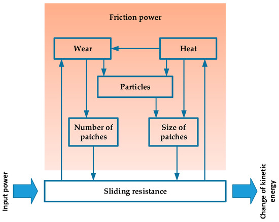 It is worth noticing that the destruction of the plateaus depends on the wear of the neighbouring plateaus, their temperature and the local mechanical stress. The described process is responsible for the equilibrium of the patch flow and thereby determines the friction and wear behaviour of the contact. The patches are responsible for the transformation of the kinetic energy into friction. In particular, both the number and size of the contact patches are tied to the heat and wear phenomena: indeed, the wear causes a particle flow that increases the size of the contact patches; the heat modulates the wear and thus the destruction of the contact patches [17]. Heat and wear are in turn induced by the sliding resistance. A schematic representation of this process is reported in Figure 2.