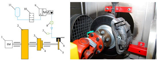 Brake dynamometer with climatic chamber, employed for experimental tests at the Technische Universität Ilmenau. 1—Drive Motor, 2—Flywheels, 3—Inertial hub, 4—Torque sensor, 5—Brake disc, 6—Brake calliper, 7—Brake pressure sensor, 8—Flow meter, 9—Master cylinder, 10—Compressed air hydraulic actuator, 11—Pressure accumulator.