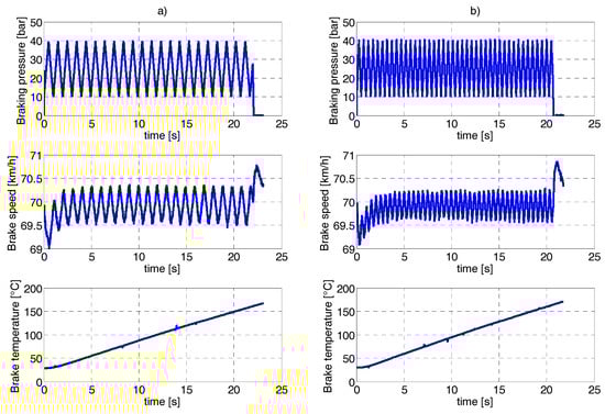 The brake pressure complies with a saw tooth signal with fixed frequency; therefore, the term in Equation (3) varies proportionally to the pressure law. In particular, the second test (Figure 4b) features an input frequency double that of the first one (Figure 4a). Moreover, during the test, the brake undergoes increasing temperature, a condition that affects the brake performance. In the first instance, the dynamic model in Equations (2) and (3) has been identified against the first set of experimental data and, in the second instance, validated against the second dataset, Figure 4. These manoeuvers emulate an extreme scenario of brake actuation that occurs in case of prolonged ABS intervention. For the model parameters identification, a minimization algorithm based on the Newton’s method has been applied [52]. Within the optimization procedure, Equations (2) and (3) are computed for the whole time providing that is set to zero when no pressure is applied on the callipers.