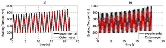 (a) Results of the identification process (first dataset); (b) results of the validation process (second dataset). Comparison between the experimental and the model-predicted braking torque.