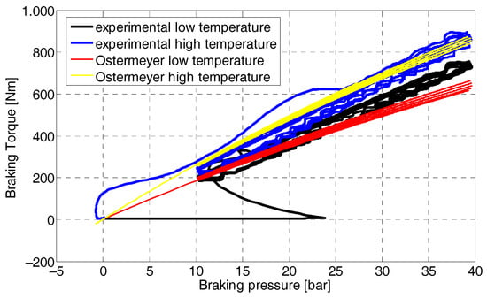In Figure 6, the resulting braking torque has been plotted against the actuated pressure in order to examine the model’s ability to reproduce the hysteresis effect. It appears clear that the model under analysis does not capture the hysteresis behaviour of the BLCF against the pressure oscillations.