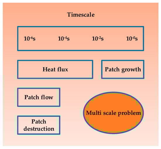 It is worth noting that the four properties are tied to each other by means of rules. The interactions among the cells’ inner variables occur on different timescales, therefore every single process has to be simulated against different time steps, as shown in Figure 8. For instance, the phenomena of patch destruction and flow occur on a time scale of µs; instead, the processes of patch birth and growth occur on a time scale ranging between and [54]. This means that in the timescale of µs the heat flux and the wear particle stream must be computed, whereas these terms can be assumed to have stationary values in the timescale of seconds. This explains why it is necessary to separate each phenomenon and integrate it with a sample time aimed at minimizing the computational burden.
