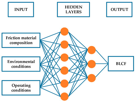 As seen previously, owing to the manifold phenomena affecting the brake operation and the awkwardness of rendering each of them, the existing analytical formulations provide unsatisfactory results. Moreover, considering that the models’ parameters must be identified over again in case of a change in the plant characteristics, it is clear that the models are unreliable for online applications. These issues led to another approach, namely artificial neural networks, which has been introduced as a tool for systematic studies of the influencing variables, such as temperature, speed and load, for the prediction of BLCF. It is a valid tool for predicting tribological properties thanks to its ability to cluster and associate experimental data. Friction is highly dependent on the brake linings’ chemical composition, environmental conditions and operating conditions; thus the application of neural networks could be useful to unveil the tangled correlations among the several parameters. Figure 9 shows an example of neural network that embeds the abovementioned dependences for BLCF calculation.