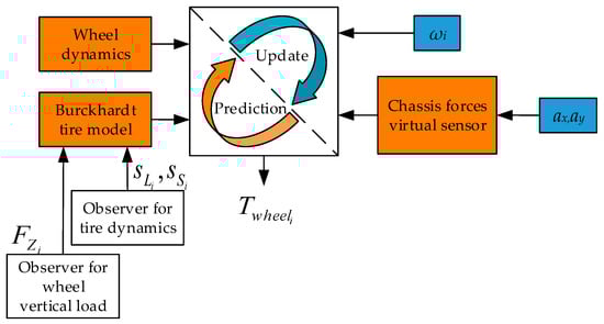 Structure of the proposed KF: the update part is based on the measurements coming from the hub sensors and the accelerometers; the prediction part relies on the wheels’ dynamics equations and on the tire model, which, in turn, requires the tire slip ratios and the vertical load.