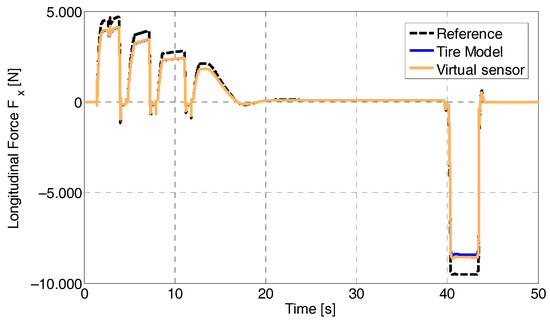 Referring to the process states of Equation (13), the hub speed of each wheel is updated once its derivative is known from the wheel dynamics of Equation (15). The process parameters, , and , are the wheel radius, the wheel inertia and the vehicle mass, respectively. In accordance with Equation (16), the longitudinal tire force is instead provided by a tire model as a function of the longitudinal and lateral wheel slips and , and the tire vertical load , e.g., the Burckhardt tire model [75]. Finally, for the wheel torque state , a random walk approach is used during the prediction step; it will then be corrected in the update phase. With reference to the output vector used during the update phase, is the hub sensor measurement for each wheel; instead, in accordance with Equation (17), represents the longitudinal force distributed on each wheel by means of the parameter, proportional to the vertical load and to the slip factors and . The apex stands for virtual sensor, and indeed the longitudinal force is virtually measured by exploiting the longitudinal accelerometer signal and a model of the longitudinal resistant forces , namely the air drag and the rolling resistance. The vertical wheel loads and the slip ratios, in turn, are observed in accordance with the methodologies reported in [75,76].