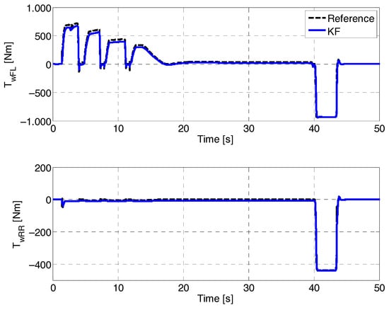 It is worth mentioning that, in [43], Martinez proposes a tool based on the extended Kalman filter to estimate the brake torque for the enhancement of the blending between the conventional and the regenerative brake for driving safety and energy recovery purposes. In particular, Martinez applies the Kalman filter to observe the temperature of each brake disc; thus a static friction model, based on a modified version of the LuGre, that takes into account the speed and temperature dependence of BLCF, is used to predict the frictional torque. The drawback is that it relies upon a friction model that, as already underlined, is not reliable for online applications. Indeed, in the case of variation in the plant characteristics or environmental conditions, the model leads the Kalman filter to a wrong estimate. The present work proposes a Kalman filter whose prediction relies on a more consolidated tire model and the virtual sensor guarantees robustness against potential faults in the model itself (e.g., variation in road conditions).