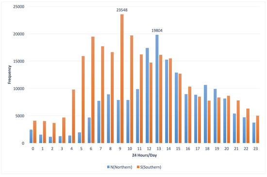 3.1. The Frequency Distribution of Vehicles vs. “the Southern and Northern Directions”