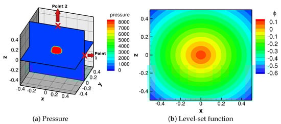 The initial setup of the underwater explosion (UNDEX) simulation with a high-pressure gas bubble in a spherical shape. (a) the initial distribution of the pressure, shown in a slice plot (surfaces and ). Two recording points, Point 1 with the position (0.5, 0.0, 0.0) and Point 2 (0.0, 0.0, 0.5) were placed at the boundaries of the computational domain; (b) a 2-D plot of the initial level-set function in the x–z surface ().